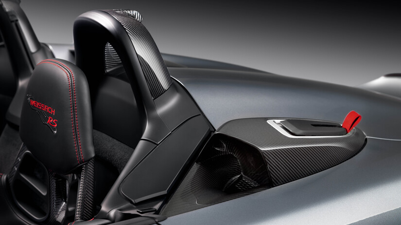 Opcionalmente también hay un pack Weissach para el Spyder RS. Las llantas de magnesio forjado opcionales, excepcionalmente ligeras, se pueden pedir en combinación con este pack centrado fundamentalmente en el rendimiento. Los tubos del sistema de escape deportivo son de titanio en el pack Weissach. El aspecto está inspirado en el 935 de edición limitada de 2018. Un punto culminante visual dentro del automóvil es la parte superior del tablero, cubierta con Race-Tex antideslumbrante. Y en exclusiva para los compradores del Porsche 718 Spyder RS se ofrece un cronógrafo hecho a mano de Porsche Design Timepieces, un reloj de primera calidad fabricado internamente por Porsche en Solothurn, Suiza. Diseñado a juego con la configuración del automóvil, su ligera caja está hecha de titanio, la esfera de carbono y la correa con el cuero del propio vehículo. El rotor de la parte trasera imita el diseño de la llanta del 718 Spyder RS.