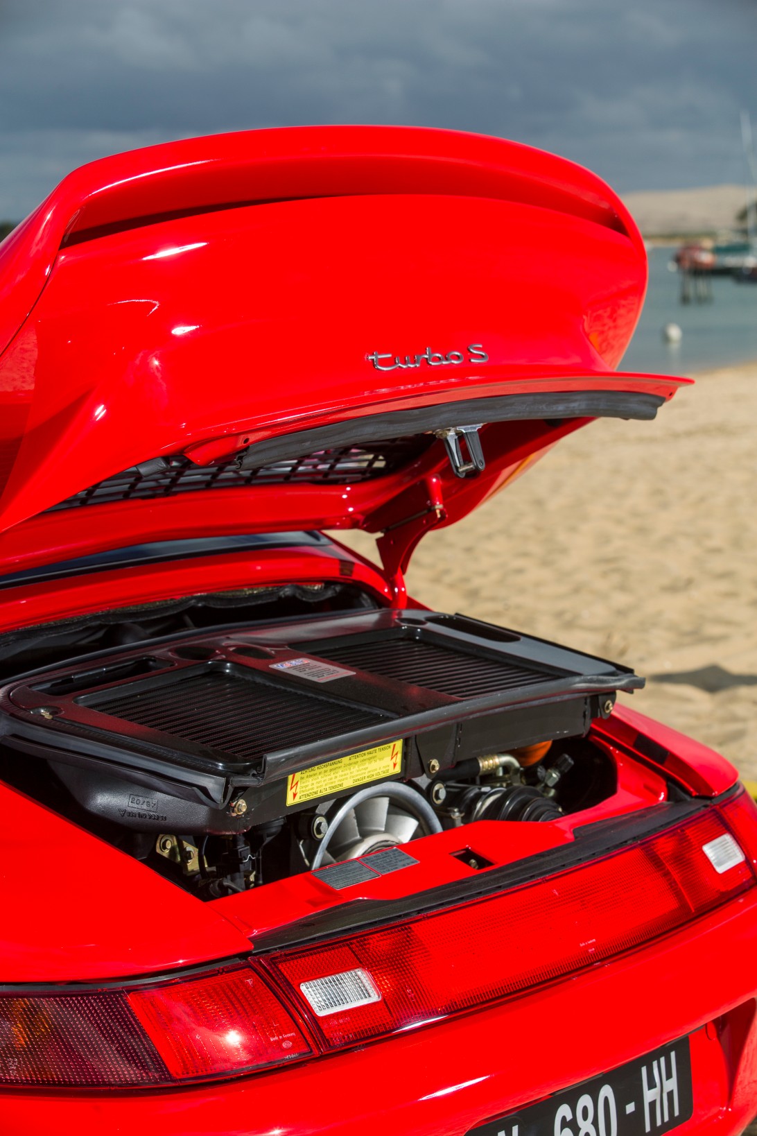 Colgado, como siempre, tras el eje trasero, el bloque boxer de seis cilindros alcanzaba los 408 CV gracias a dos turbos KKK K16 muy compactos y del mismo tamaño. Se rechazó el uso de turbos secuencias del 959 por la complejidad que presentaba y se optó por montar turbinas simétricas. Además, eran turbos con muy poca inercia y el propulsor ofrecía nada menos que 450 Nm de par a 2.500 rpm (para un total de 540 Nm). Y todavía quedaban otras 4.300 revoluciones por exprimir hasta el corte de encendido. La aceleración era espectacular, con un 0 a 100 km/h en 4,5 segundos. La velocidad punta era de 290 km/h. Posteriormente llegó el Porsche 993 Turbo S con 430 CV y un 0 a 100 km/h en 3,9 segundos.