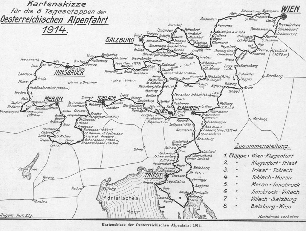 El 26 de junio de 1910 se celebró la primera prueba del Österreichiste Alpenfahrt, competición que por su localización rápidamente atrajo a numerosos pilotos de la zona centroeuropea, quienes consideraban su trazado puramente alpino como un auténtico reto a superar. El recorrido del rally discurría a través de los hermosos pasos de montaña de los Alpes austriacos, muchos de ellos por aquel entonces aún sin pavimentar, superando pronunciadas pendientes y sinuosos caminos de tierra, lo que rápidamente otorgó al trazado del rally una cierta fama de duro y exigente. Todo ello lo convirtió en su momento en una de las pruebas más formidables a las que se podía someter un hombre y su máquina.