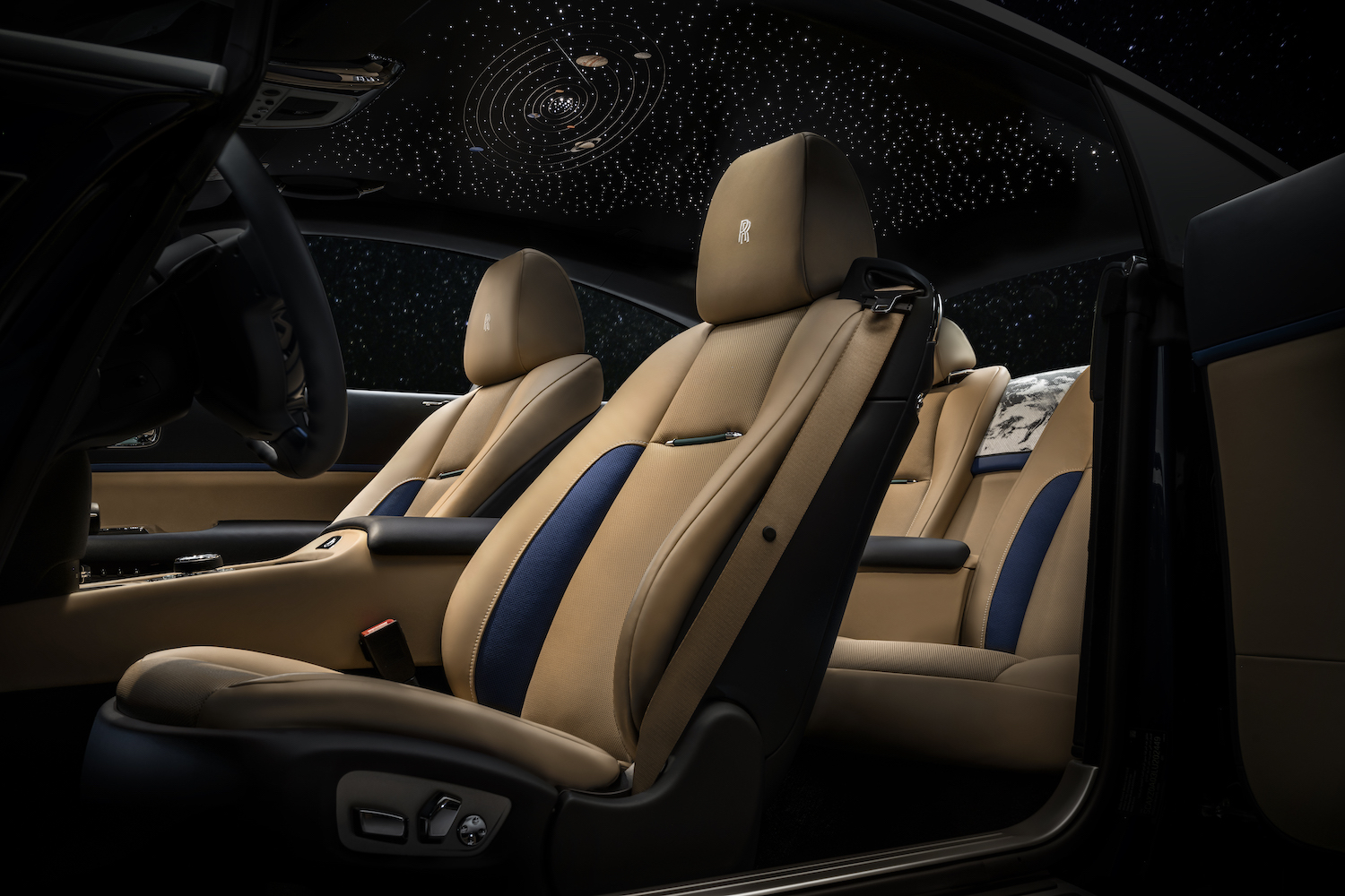 El inigualable techo interior Starlight de Rolls Royce, dotado con hasta 100 luces LED que lo iluminan como si circuláramos en un descapotable, también ofrece un acabado espectacular en este Wraith “inspired by the Earth”, elaborado especialmente a medida Epara cubrir la superficie acristalada Starlight. Su acabado en tela ha sido especialmente bordado para ilustrar todos los planetas del Sistema Solar, centrados alrededor del Sol.