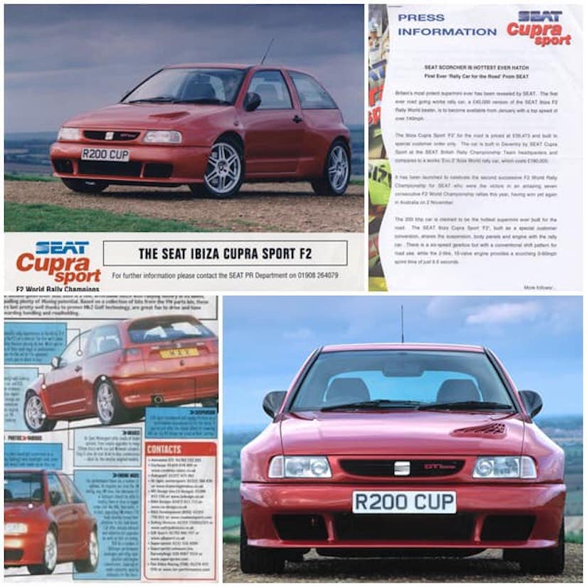 El caso es que existió un Cupra todavía más racing, más espectacular y deportivo, pero nunca llegó a producción y quedó como un prototipo del cual, solo existen dos fotos oficiales. Seguro que sabes de qué coche hablamos: el SEAT Ibiza Cupra F2 o SEAT Ibiza GTi 16v R200 Cup, como lucía su placa de matrícula. También se le conoce como SEAT Ibiza Cupra Sport F2. Siempre según la fuente, claro. Básicamente, era un Ibiza Kit Car adaptado a las vías públicas, con una carrocería mucho más ancha, un paragolpes delantero con entradas de aire más grandes –y funciones aerodinámicas adicionales–, espejos muy pequeños y el mismo propulsor de cuatro cilindros y dos litros atmosférico adaptado al Grupo A, con 200 CV –y desarrollado con la ayuda de Lehman, cuya versión de competición rondaba entre los 225 y los 230 CV–.