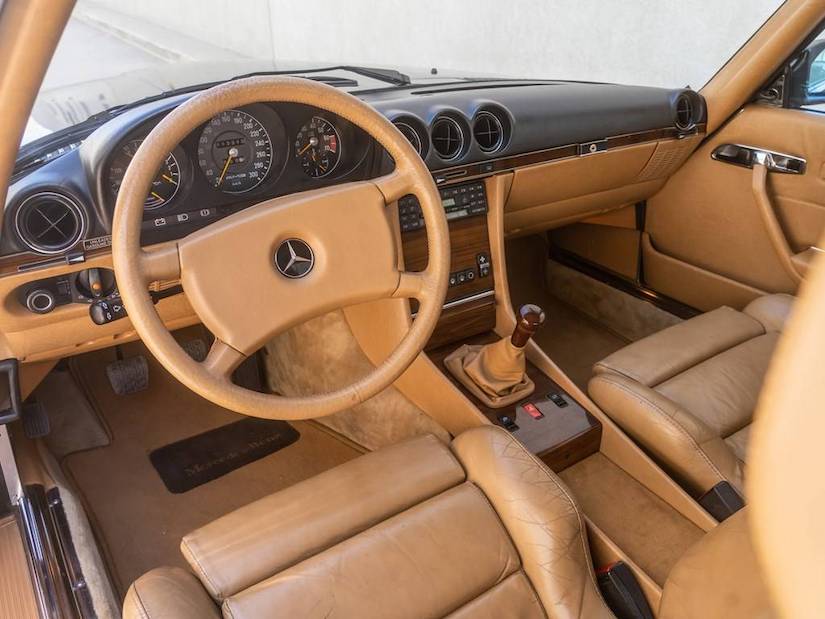 Fuerte contraste encontramos en el habitáculo, gracias a un salpicadero de color negro, Combina con una tapicería de color marrón claro (algunos lo definiría como marrón «camel»), que ofrece una imagen interior con categoría y cierto gasto por lo estético, lejos de las combinaciones actuales, que en ocasiones, resultan un tanto burdas y faltas de clase. Además, si eres observador, podrás apreciar que hay tres pedales y un selector para un cambio manual. Algo totalmente inédito en un Mercedes SL500 R107. Todos los SL500 se ofrecían con cambio automático.
