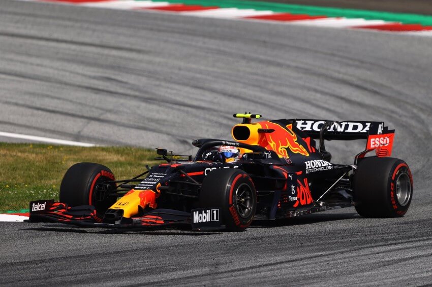 La predicción de Pirelli para este Gran Premio de Estiria fue a una sola parada, pero Red Bull decidió que el mexicano fuera a dos. Se puso a la par de Norris en el inicio, pero no pudo superarlo. Tuvo que esperar hasta la vuelta 10 para tomar el tercer puesto. A pesar de esto, durante su primer stint no pudo acercarse a Verstappen y Hamilton.
