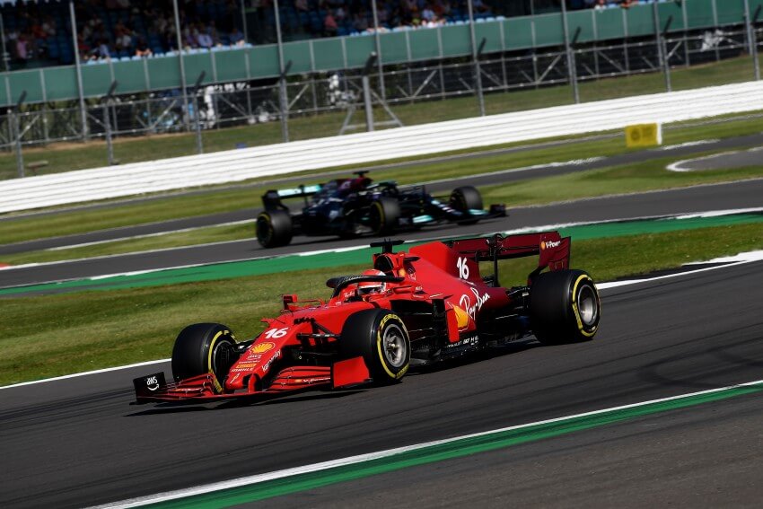 La carrera de este domingo se torció para Verstappen en la primera vuelta. En la curva Copse (9), Hamilton intentó adelantarlo por el interior, pero se tocaron y el neerlandés terminó contra el muro, sufriendo un fuerte golpe pero saliendo del coche sin complicaciones. Tras una larga bandera roja, Leclerc mantuvo la primera posición que había ganado tras el incidente. Allí comenzó la batalla del piloto de Ferrari contra los Mercedes. Por momentos, el británico era el más rápido en la pista y por momentos era el monegasco. El Mercedes, como es lógico, tenía un mejor ritmo que el coche rival, pero los 10 segundos de sanción a Hamilton por el toque a Verstappen hicieron que la batalla durara hasta las últimas vueltas.